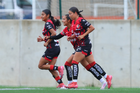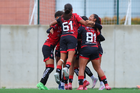 Guadalajara, Jalisco, 25 de septiembre de 2025. Jugadoras de Atlas en festejo de gol, durante el partido correspondiente a la jornada 12 del torneo Apertura 2025 de la Liga BBVA MX Femenil categoría Sub19, entre las Rojinegras del Atlas y las Tigres de la UANL, realizado en la Academia AGA. Foto: Imago7/ Juan Carlos Cubeyro.