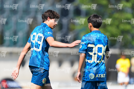Toluca, Estado de México, 19 de abril de 2025. Jugadores del America, durante el partido correspondiente a la jornada 2 del torneo Primavera 2025 de la Liga BBVA MX categoría Sub14, entre los Venados de Yucatán y las Águilas del América, realizado en las instalaciones de la Federación Mexicana de Futbol. Foto: Imago7/ Manlio Contreras