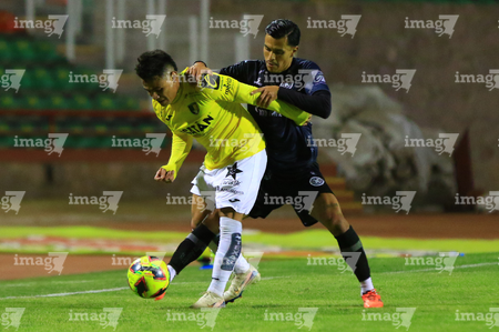 Zacatecas, Zacatecas, 27 de abril de 2025. Brandón Espinosa y Luis Calzadilla, durante el partido correspondiente a la vuelta de los Cuartos de Final del torneo Clausura 2025 de la Liga BBVA Expansión MX, entre los Mineros de Zacatecas y los Venados de Merida, realizado en el estadio Carlos Vega Villalba. Foto: Imago7/ Raúl Martínez