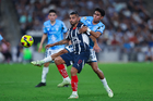 Guadalupe, Nuevo León, 27 de abril de 2025. Carlos Sánchez, Gerardo Arteaga y Alexei Domínguez, durante el partido correspondiente al Play In del torneo Clausura 2025 de la Liga BBVA MX, entre los Rayados del Monterrey y los Tuzos del Pachuca, realizado en el estadio BBVA. Foto: Imago7/