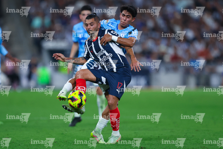 Guadalupe, Nuevo León, 27 de abril de 2025. Roberto de la Rosa y Daniel Aceves, durante el partido correspondiente al Play In del torneo Clausura 2025 de la Liga BBVA MX, entre los Rayadas del Monterrey y los Tuzos del Pachuca, realizado en el estadio BBVA. Foto: Imago7/Richard Vogel