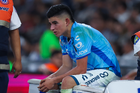 Guadalupe, Nuevo León, 27 de abril de 2025. Daniel Aceves en lamento, durante el partido correspondiente al Play In del torneo Clausura 2025 de la Liga BBVA MX, entre los Rayados del Monterrey y los Tuzos del Pachuca, realizado en el estadio BBVA. Foto: Imago7/