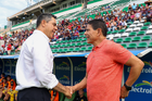 Zacatepec, Morelos, 20 de septiembre de 2025. Miguel Fuentes, director técnico y Luis Alfonso Sosa director técnico, durante el partido correspondiente a la jornada 8 del torneo Apertura 2025 de la Liga BBVA Expansión MX, entre los Potros de Hierro del Atlante FC y los Leones Negros de la UDG, realizado en el estadio Agustín Coruco Díaz. Foto: Imago7/ Daniel Sydney