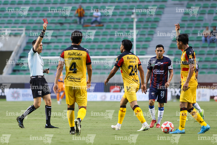 Zacatepec, Morelos, 20 de septiembre de 2025. Aldo Ballesteros Barba expulsa a Juan Aguayo, durante el partido correspondiente a la jornada 8 del torneo Apertura 2025 de la Liga BBVA Expansión MX, entre los Potros de Hierro del Atlante FC y los Leones Negros de la UDG, realizado en el estadio Agustín Coruco Díaz. Foto: Imago7/ Daniel Sydney