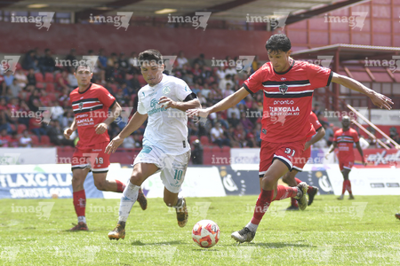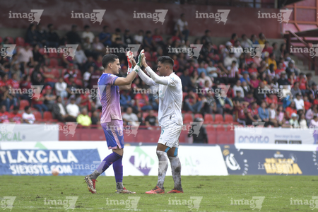 Tlaxcala, Tlaxcala, 28 de septiembre de 2025. Juan Lázaro y Martín Barragán, durante el partido correspondiente a la jornada 9 del torneo Apertura 2025 de la Liga BBVA Expansión MX, entre los Coyotes de Tlaxcala y el Atlético La Paz, realizado en el estadio Tlahuicole. Foto: Imago7/ Liz Romero