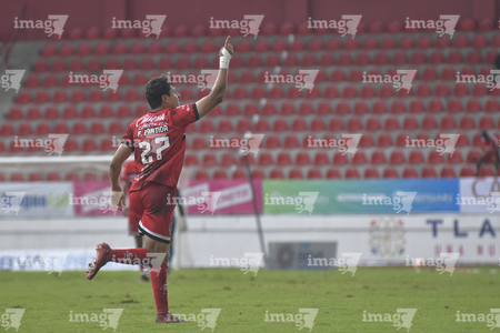 Tlaxcala, Tlaxcala, 28 de septiembre de 2025. Víctor Mendoza en festejo, durante el partido correspondiente a la jornada 9 del torneo Apertura 2025 de la Liga BBVA Expansión MX, entre los Coyotes de Tlaxcala y el Atlético La Paz, realizado en el estadio Tlahuicole. Foto: Imago7/ Liz Romero