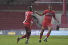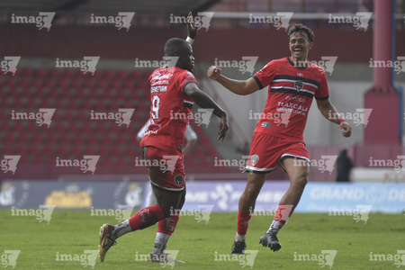 Tlaxcala, Tlaxcala, 28 de septiembre de 2025. Jordan Silva en festejo de gol, durante el partido correspondiente a la jornada 9 del torneo Apertura 2025 de la Liga BBVA Expansión MX, entre los Coyotes de Tlaxcala y el Atlético La Paz, realizado en el estadio Tlahuicole. Foto: Imago7/ Liz Romero