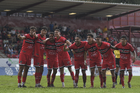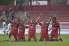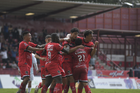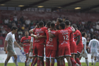 Tlaxcala, Tlaxcala, 28 de septiembre de 2025. Jugadores de Atlético La Paz en festejo, durante el partido correspondiente a la jornada 9 del torneo Apertura 2025 de la Liga BBVA Expansión MX, entre los Coyotes de Tlaxcala y el Atlético La Paz, realizado en el estadio Tlahuicole. Foto: Imago7/ Liz Romero