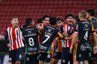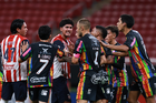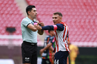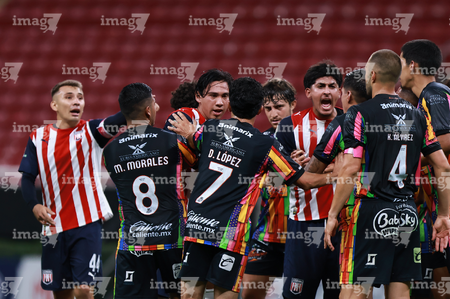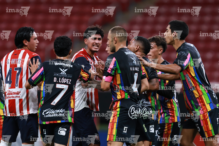 Zapopan, Jalisco, 3 de octubre de 2025. Jugadores de Tapatío en conato de bronca, durante el partido correspondiente a la jornada 10 del torneo Apertura 2025 de la Liga BBVA Expansión MX, entre el CD Tapatío y Alebrijes de Oaxaca, realizado en el estadio Akron. Foto: Imago7/Cristian Hernandez