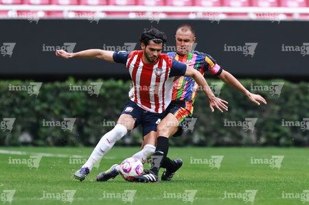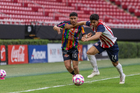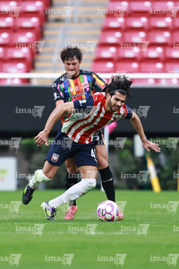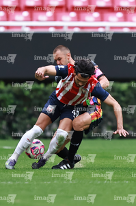 Zapopan, Jalisco, 3 de octubre de 2025. Vladimir Moragrega y Kristian Álvarez, durante el partido correspondiente a la jornada 10 del torneo Apertura 2025 de la Liga BBVA Expansión MX, entre el CD Tapatío y Alebrijes de Oaxaca, realizado en el estadio Akron. Foto: Imago7/Cristian Hernandez