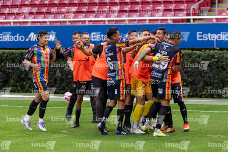 Zapopan, Jalisco, 3 de octubre de 2025. Jugadores de Alebrijes en festejo de gol, durante el partido correspondiente a la jornada 10 del torneo Apertura 2025 de la Liga BBVA Expansión MX, entre el CD Tapatío y Alebrijes de Oaxaca, realizado en el estadio Akron. Foto: Imago7/ Jair Terán