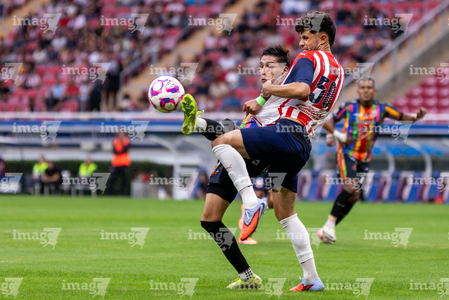 Zapopan, Jalisco, 3 de octubre de 2025. Sergio Meza y Raúl Martínez, durante el partido correspondiente a la jornada 10 del torneo Apertura 2025 de la Liga BBVA Expansión MX, entre el CD Tapatío y Alebrijes de Oaxaca, realizado en el estadio Akron. Foto: Imago7/ Jair Terán