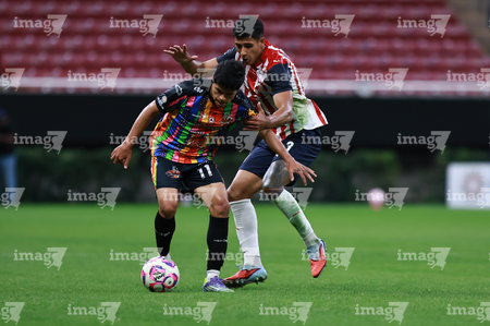 Zapopan, Jalisco, 3 de octubre de 2025. Luis Ledesma y Fernando Morales, durante el partido correspondiente a la jornada 10 del torneo Apertura 2025 de la Liga BBVA Expansión MX, entre el CD Tapatío y Alebrijes de Oaxaca, realizado en el estadio Akron. Foto: Imago7/Cristian Hernandez