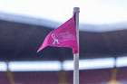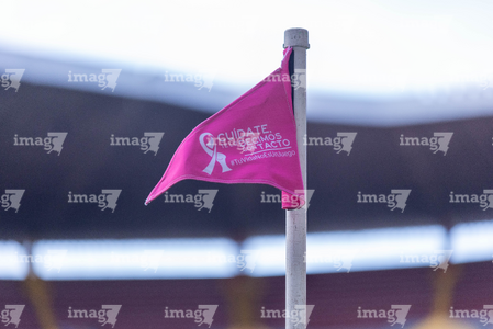 Guadalajara, Jalisco, 3 de octubre de 2025. Banderín de tiro de esquina de la Campaña Rosa para la concientización del Cáncer de Mama, durante el partido correspondiente a la jornada 10 del torneo Apertura 2025 de la Liga BBVA Expansión MX, entre los Leones Negros de la UDG y los Dorados de Sinaloa, realizado en el estadio Jalisco. Foto: Imago7/ Jair Terán
