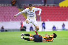 Guadalajara, Jalisco, 3 de octubre de 2025. Leonardo Vargas, durante el partido correspondiente a la jornada 10 del torneo Apertura 2025 de la Liga BBVA Expansión MX, entre los Leones Negros de la UDG y los Dorados de Sinaloa, realizado en el estadio Jalisco. Foto: Imago7/ Juan Carlos Cubeyro.