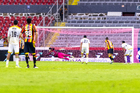 Guadalajara, Jalisco, 3 de octubre de 2025. Jonathan Vaal ataja penal, durante el partido correspondiente a la jornada 10 del torneo Apertura 2025 de la Liga BBVA Expansión MX, entre los Leones Negros de la UDG y los Dorados de Sinaloa, realizado en el estadio Jalisco. Foto: Imago7/ Jair Terán