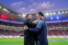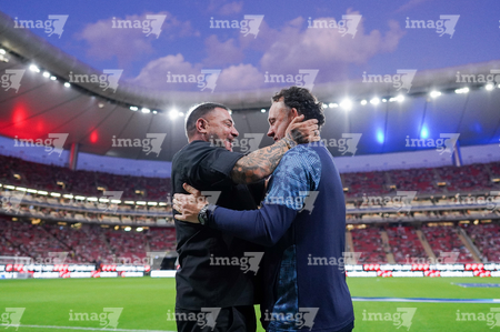Zapopan, Jalisco, 20 de septiembre de 2025. Antonio Mohamed "Turco" y Gabriel Milito, durante el partido correspondiente a la jornada 9 del torneo Apertura 2025 de la Liga BBVA MX, entre las Chivas Rayadas del Guadalajara y los Diablos Rojos del Toluca, realizado en el estadio Akron. Foto: Imago7/ Hugo Ramírez