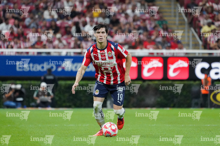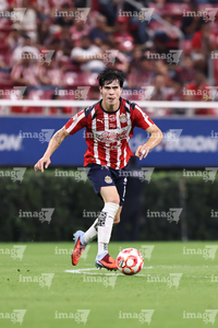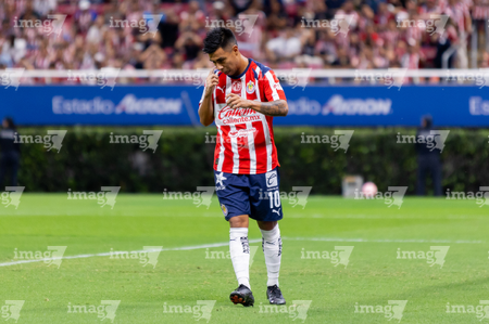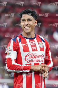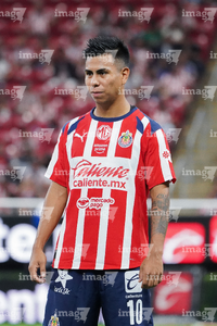 Zapopan, Jalisco, 20 de septiembre de 2025. Alexis Vega, durante el partido correspondiente a la jornada 9 del torneo Apertura 2025 de la Liga BBVA MX, entre las Chivas Rayadas del Guadalajara y los Diablos Rojos del Toluca, realizado en el estadio Akron. Foto: Imago7/ Jair Terán