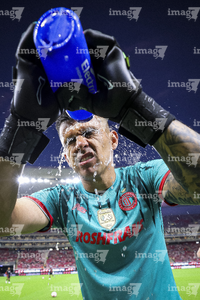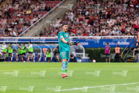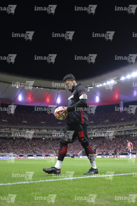 Zapopan, Jalisco, 20 de septiembre de 2025. Juan Pablo Domínguez atrapa vaso arrojado a la cancha, durante el partido correspondiente a la jornada 9 del torneo Apertura 2025 de la Liga BBVA MX, entre las Chivas Rayadas del Guadalajara y los Diablos Rojos del Toluca, realizado en el estadio Akron. Foto: Imago7/ Rafael Vadillo