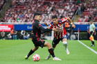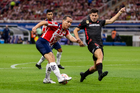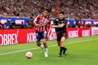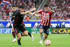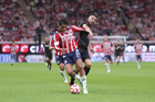 Zapopan, Jalisco, 20 de septiembre de 2025. Efraín Álvarez y Nicolás Castro, durante el partido correspondiente a la jornada 9 del torneo Apertura 2025 de la Liga BBVA MX, entre las Chivas Rayadas del Guadalajara y los Diablos Rojos del Toluca, realizado en el estadio Akron. Foto: Imago7/ Hugo Ramírez