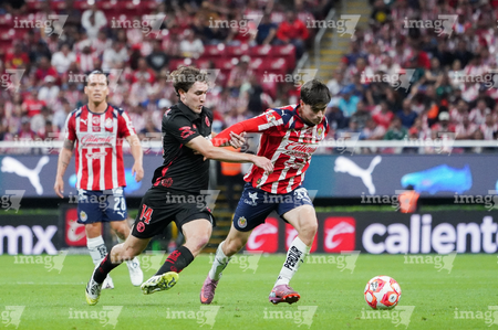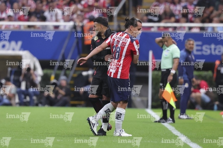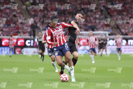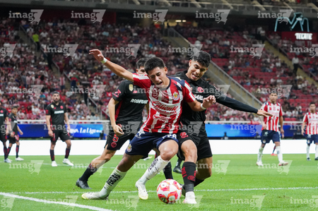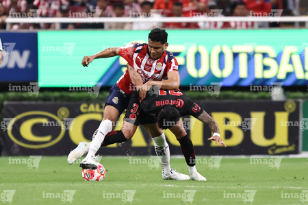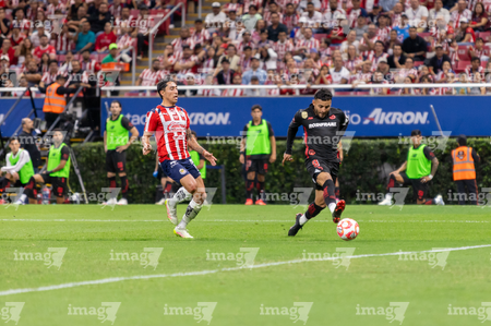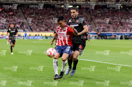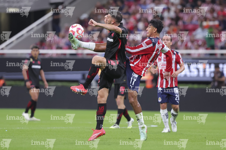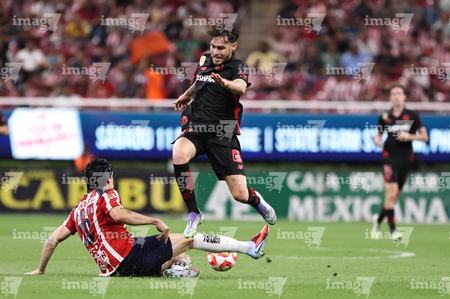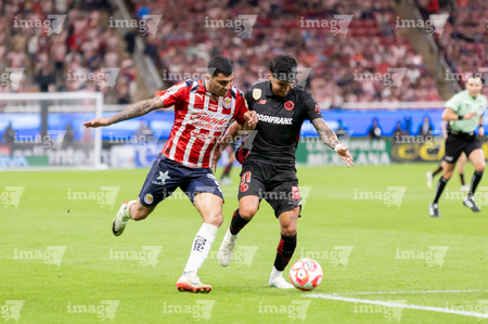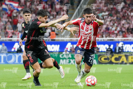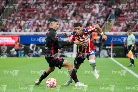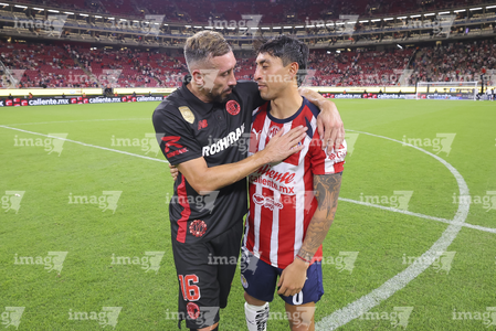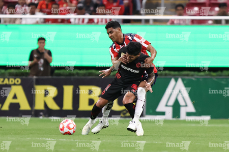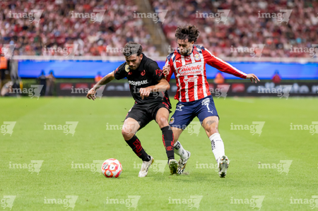 Zapopan, Jalisco, 20 de septiembre de 2025. Jesús Angulo "Canelo" y Miguel Tapias, durante el partido correspondiente a la jornada 9 del torneo Apertura 2025 de la Liga BBVA MX, entre las Chivas Rayadas del Guadalajara y los Diablos Rojos del Toluca, realizado en el estadio Akron. Foto: Imago7/ Rafael Vadillo