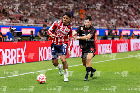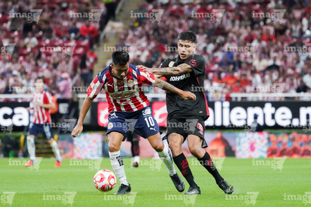 Zapopan, Jalisco, 20 de septiembre de 2025. Alexis Vega y Jesús Angulo "Canelo", durante el partido correspondiente a la jornada 9 del torneo Apertura 2025 de la Liga BBVA MX, entre las Chivas Rayadas del Guadalajara y los Diablos Rojos del Toluca, realizado en el estadio Akron. Foto: Imago7/ Rafael Vadillo