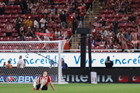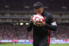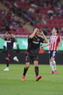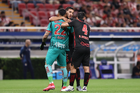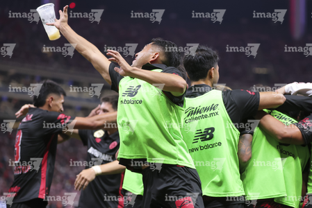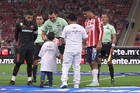 Zapopan, Jalisco, 20 de septiembre de 2025. Paulinho saca vasos que fueron arrojados al campo, durante el partido correspondiente a la jornada 9 del torneo Apertura 2025 de la Liga BBVA MX, entre las Chivas Rayadas del Guadalajara y los Diablos Rojos del Toluca, realizado en el estadio Akron. Foto: Imago7/ Rafael Vadillo