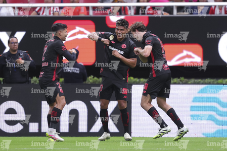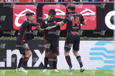 Zapopan, Jalisco, 20 de septiembre de 2025. Jugadores del Toluca en festejo de gol, durante el partido correspondiente a la jornada 9 del torneo Apertura 2025 de la Liga BBVA MX, entre las Chivas Rayadas del Guadalajara y los Diablos Rojos del Toluca, realizado en el estadio Akron. Foto: Imago7/Cristian Hernandez