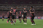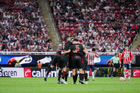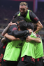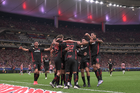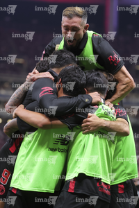 Zapopan, Jalisco, 20 de septiembre de 2025. Jugadores del Toluca en festejo, durante el partido correspondiente a la jornada 9 del torneo Apertura 2025 de la Liga BBVA MX, entre las Chivas Rayadas del Guadalajara y los Diablos Rojos del Toluca, realizado en el estadio Akron. Foto: Imago7/ Rafael Vadillo