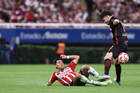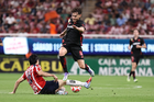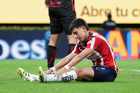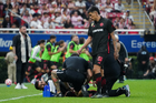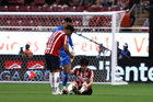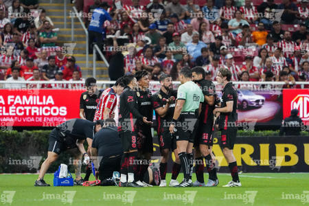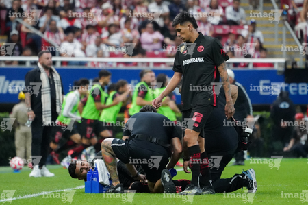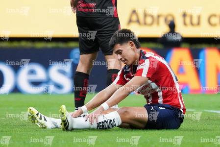 Zapopan, Jalisco, 20 de septiembre de 2025. Alexis Vega resultó lesionado, durante el partido correspondiente a la jornada 9 del torneo Apertura 2025 de la Liga BBVA MX, entre las Chivas Rayadas del Guadalajara y los Diablos Rojos del Toluca, realizado en el estadio Akron. Foto: Imago7/ Hugo Ramírez