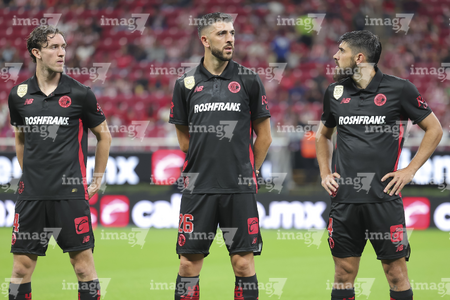 Zapopan, Jalisco, 20 de septiembre de 2025. Marcel Ruiz, Paulinho y Bruno Mendez, durante el partido correspondiente a la jornada 9 del torneo Apertura 2025 de la Liga BBVA MX, entre las Chivas Rayadas del Guadalajara y los Diablos Rojos del Toluca, realizado en el estadio Akron. Foto: Imago7/ Rafael Vadillo