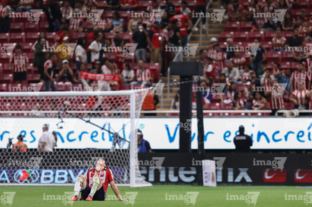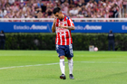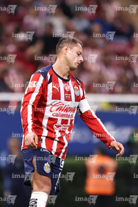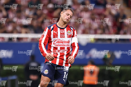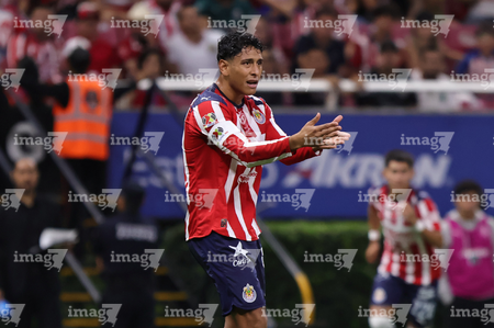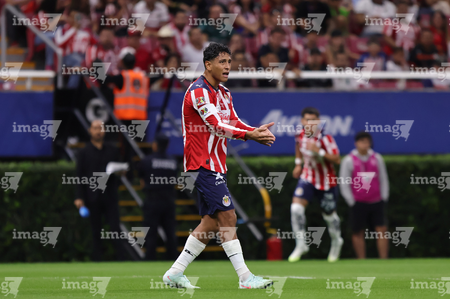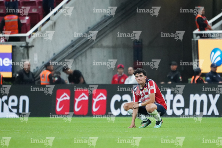 Zapopan, Jalisco, 20 de septiembre de 2025. Jesús Gallardo en lamento, durante el partido correspondiente a la jornada 9 del torneo Apertura 2025 de la Liga BBVA MX, entre las Chivas Rayadas del Guadalajara y los Diablos Rojos del Toluca, realizado en el estadio Akron. Foto: Imago7/ Rafael Vadillo