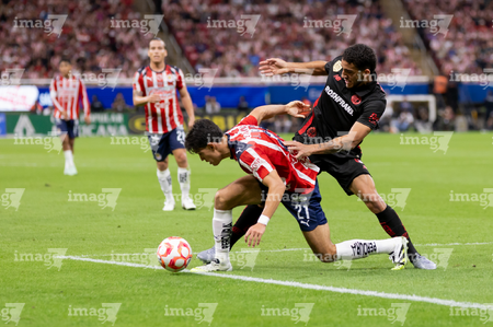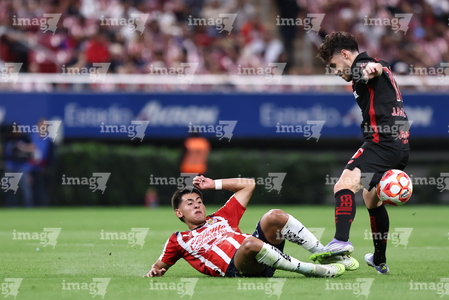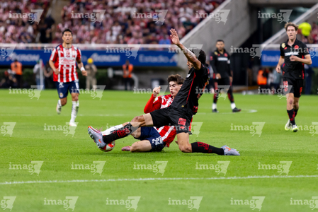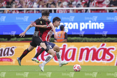 Zapopan, Jalisco, 20 de septiembre de 2025. Jesús Gallardo y Luis Romo, durante el partido correspondiente a la jornada 9 del torneo Apertura 2025 de la Liga BBVA MX, entre las Chivas Rayadas del Guadalajara y los Diablos Rojos del Toluca, realizado en el estadio Akron. Foto: Imago7/ Rafael Vadillo