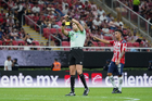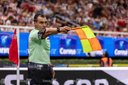 Zapopan, Jalisco, 20 de septiembre de 2025. Erick Durón Martínez, árbitro asistente, durante el partido correspondiente a la jornada 9 del torneo Apertura 2025 de la Liga BBVA MX, entre las Chivas Rayadas del Guadalajara y los Diablos Rojos del Toluca, realizado en el estadio Akron. Foto: Imago7/ Jair Terán