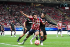 Zapopan, Jalisco, 20 de septiembre de 2025. Bruno Mendez y Javier Hernández "Chicharito", durante el partido correspondiente a la jornada 9 del torneo Apertura 2025 de la Liga BBVA MX, entre las Chivas Rayadas del Guadalajara y los Diablos Rojos del Toluca, realizado en el estadio Akron. Foto: Imago7/Cristian Hernandez