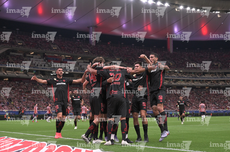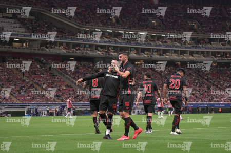 Zapopan, Jalisco, 20 de septiembre de 2025. Alexis Vega y Paulinho en festejo de gol, durante el partido correspondiente a la jornada 9 del torneo Apertura 2025 de la Liga BBVA MX, entre las Chivas Rayadas del Guadalajara y los Diablos Rojos del Toluca, realizado en el estadio Akron. Foto: Imago7/Cristian Hernandez
