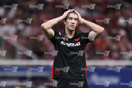 Zapopan, Jalisco, 20 de septiembre de 2025. Robert Morales en lamento, durante el partido correspondiente a la jornada 9 del torneo Apertura 2025 de la Liga BBVA MX, entre las Chivas Rayadas del Guadalajara y los Diablos Rojos del Toluca, realizado en el estadio Akron. Foto: Imago7/ Rafael Vadillo