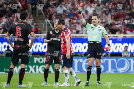 Zapopan, Jalisco, 20 de septiembre de 2025. Marco Antonio Ortiz, árbitro central, muestra tarjeta roja de expulsión a Rubén González, durante el partido correspondiente a la jornada 9 del torneo Apertura 2025 de la Liga BBVA MX, entre las Chivas Rayadas del Guadalajara y los Diablos Rojos del Toluca, realizado en el estadio Akron. Foto: Imago7/ Hugo Ramírez