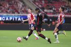 Zapopan, Jalisco, 20 de septiembre de 2025. Jesús Angulo "Canelo", durante el partido correspondiente a la jornada 9 del torneo Apertura 2025 de la Liga BBVA MX, entre las Chivas Rayadas del Guadalajara y los Diablos Rojos del Toluca, realizado en el estadio Akron. Foto: Imago7/ Rafael Vadillo