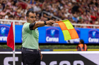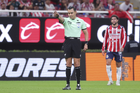 Zapopan, Jalisco, 20 de septiembre de 2025. Marco Antonio Ortiz, árbitro central, durante el partido correspondiente a la jornada 9 del torneo Apertura 2025 de la Liga BBVA MX, entre las Chivas Rayadas del Guadalajara y los Diablos Rojos del Toluca, realizado en el estadio Akron. Foto: Imago7/ Rafael Vadillo