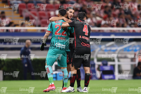 Zapopan, Jalisco, 20 de septiembre de 2025. Diego Barbosa, Jesús Gallardo y Marcel Ruiz en festejo de gol, durante el partido correspondiente a la jornada 9 del torneo Apertura 2025 de la Liga BBVA MX, entre las Chivas Rayadas del Guadalajara y los Diablos Rojos del Toluca, realizado en el estadio Akron. Foto: Imago7/ Rafael Vadillo