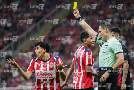 Zapopan, Jalisco, 20 de septiembre de 2025. Marco Antonio Ortiz, árbitro central, muestra tarjeta amarilla de amonestación, durante el partido correspondiente a la jornada 9 del torneo Apertura 2025 de la Liga BBVA MX, entre las Chivas Rayadas del Guadalajara y los Diablos Rojos del Toluca, realizado en el estadio Akron. Foto: Imago7/ Hugo Ramírez