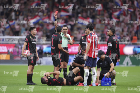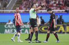 Zapopan, Jalisco, 20 de septiembre de 2025. Marco Antonio Ortiz, árbitro central, muestra tarjeta roja de expulsión a Bruno Mendez, durante el partido correspondiente a la jornada 9 del torneo Apertura 2025 de la Liga BBVA MX, entre las Chivas Rayadas del Guadalajara y los Diablos Rojos del Toluca, realizado en el estadio Akron. Foto: Imago7/ Rafael Vadillo
