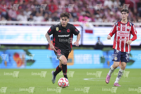 Zapopan, Jalisco, 20 de septiembre de 2025. Miguel Gómez, durante el partido correspondiente a la jornada 9 del torneo Apertura 2025 de la Liga BBVA MX, entre las Chivas Rayadas del Guadalajara y los Diablos Rojos del Toluca, realizado en el estadio Akron. Foto: Imago7/ Hugo Ramírez