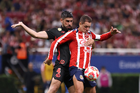 Zapopan, Jalisco, 20 de septiembre de 2025. José Castillo y Federico Pereira, durante el partido correspondiente a la jornada 9 del torneo Apertura 2025 de la Liga BBVA MX, entre las Chivas Rayadas del Guadalajara y los Diablos Rojos del Toluca, realizado en el estadio Akron. Foto: Imago7/ Jair Terán