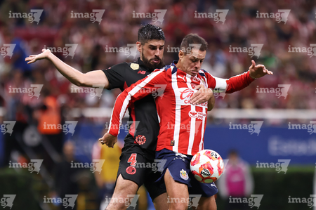 Zapopan, Jalisco, 20 de septiembre de 2025. Héctor Herrera y Omar Govea, durante el partido correspondiente a la jornada 9 del torneo Apertura 2025 de la Liga BBVA MX, entre las Chivas Rayadas del Guadalajara y los Diablos Rojos del Toluca, realizado en el estadio Akron. Foto: Imago7/ Rafael Vadillo