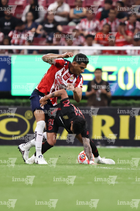 Zapopan, Jalisco, 20 de septiembre de 2025. Armando González y Franco Romero, durante el partido correspondiente a la jornada 9 del torneo Apertura 2025 de la Liga BBVA MX, entre las Chivas Rayadas del Guadalajara y los Diablos Rojos del Toluca, realizado en el estadio Akron. Foto: Imago7/ Hugo Ramírez