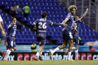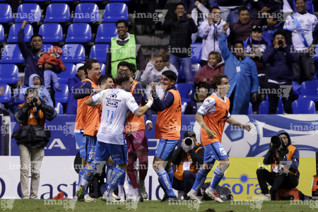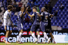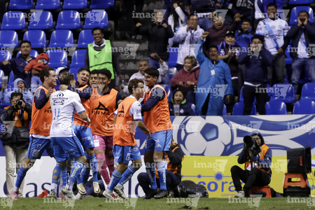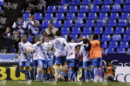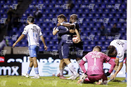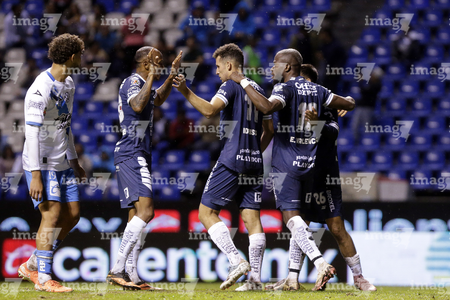 Puebla, Puebla, 23 de septiembre de 2025. Jugadores del Club Puebla en festejo de gol, durante el partido correspondiente a la jornada 10 del torneo Apertura 2025 de la Liga BBVA MX, entre el Club Puebla y los Tuzos del Pachuca, realizado en el estadio Cuauhtémoc. Foto: Imago7/Mireya Novo