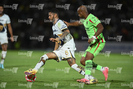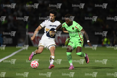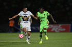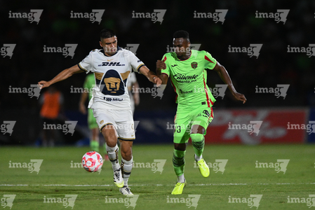 Ciudad Juárez, Chihuahua, 23 de septiembre de 2025. José Caicedo y Oscar Estupiñan, durante el partido correspondiente a la jornada 10 del torneo Apertura 2025 de la Liga BBVA MX, entre los Bravos de FC Juárez y los Pumas de la UNAM, realizado en realizado en el estadio Olímpico Benito Juárez. Foto: Imago7/ José Zamora