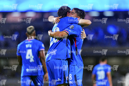 Ciudad de México, 24 de septiembre de 2025. Blu y Atlantis Jr., durante el partido correspondiente a la jornada 10 del torneo Apertura 2025 de la Liga BBVA MX, entre la Máquina Celeste del Cruz Azul y los Gallos Blancos del Querétaro, realizado en el estadio Olímpico Universitario. Foto: Imago7/ Manlio Contreras